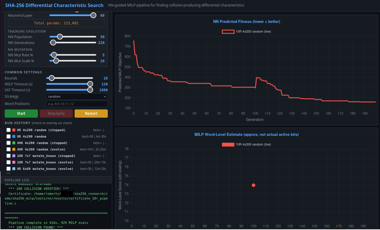 I hope they have good results and keep all the data they need, and identify all the interesting data they're looking for. I do have a cautionary tale about mini neural networks in new experiments. We recently spent a large amount of time training a mini neural network (200k parameters) to make new predictions in a very difficult domain (predicting specific trails for further round collisions in a hash function than anyone did before.) We put up a spiffy internal dashboard[1] where we could tune parameters and see how well the neural network learns the existing results. We got to r^2 of 0.85 (that is very good correlation) on the data that already existed, from other people's records and from the data we solved for previously. It showed such a nicely dropping loss function as it trained, brings tears to the eye, we were pumped to see how it performs on data it didn't see before, data that was too far out to solve for. So many parameters to tune! We thought we could beat the world record by 1 round with it (40 instead of 39 rounds), and then let the community play with it to see if they can train it even better, to predict the inputs that let us brute force 42 round collisions, or even more. We could put up a leaderboard. The possiblities were endless, all it had to do was do extrapolate some input values by one round. We'd take the rest from there with the rest of our solving instrastructure.